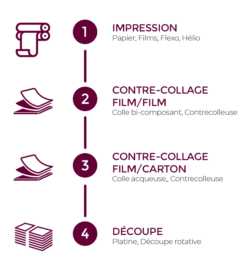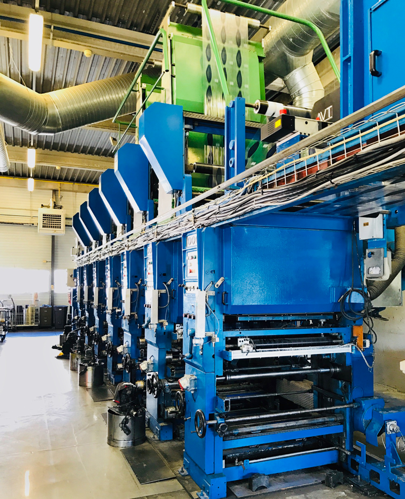 Rotatif : les matières premières principales sont fournies sous forme de bobines : cartons, papiers, films.